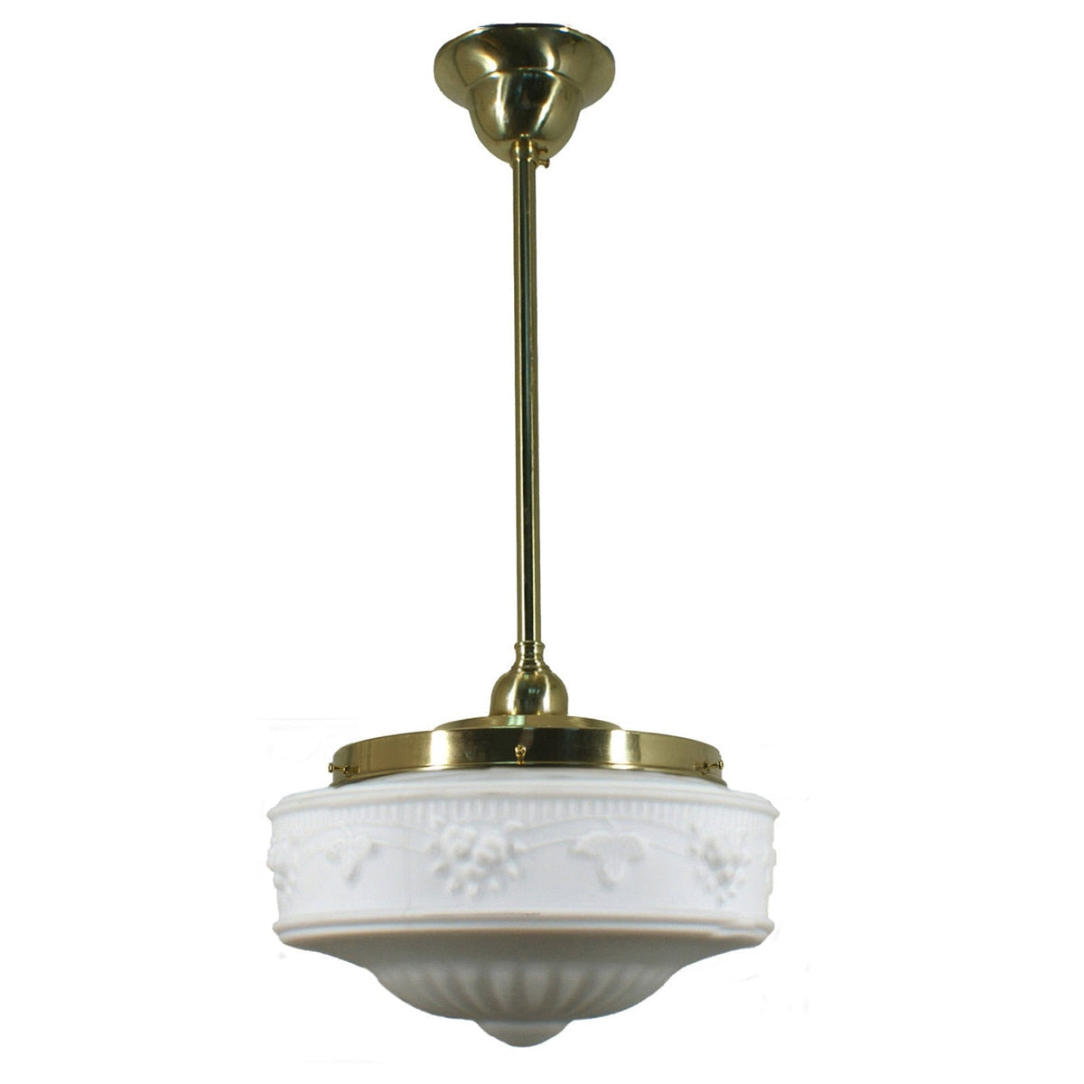 The Senator 11'' Opal Matte on Rod Set 1/2'' x 1/2m Polished Brass combines the best of heritage lighting with the elegance of Edwardian-era design, exuding timeless sophistication. The classic glass shade, adorned with a raised floral vine motif, brings vintage charm to bedrooms, hallways, bathrooms or living areas. Suspended by rod set manufactured from high-quality solid brass, it offers warm ambient lighting while enhancing traditional interiors with its refined and enduring style.
