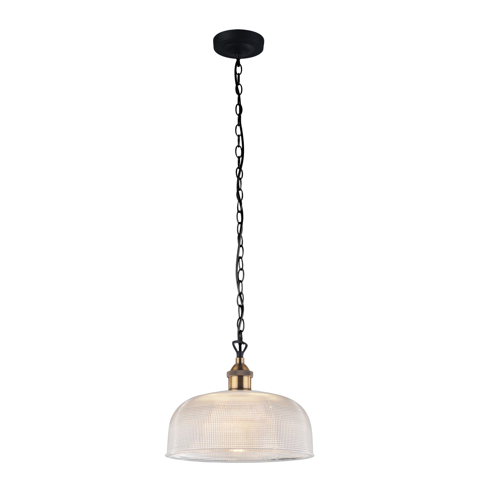 MAISON.27 halophane glass shaded pendant on a black and antique brass chain suspension. Ideal compliment to our Industrial Vintage lighting range. Lovely solid glass, also available as a 150mm shade.