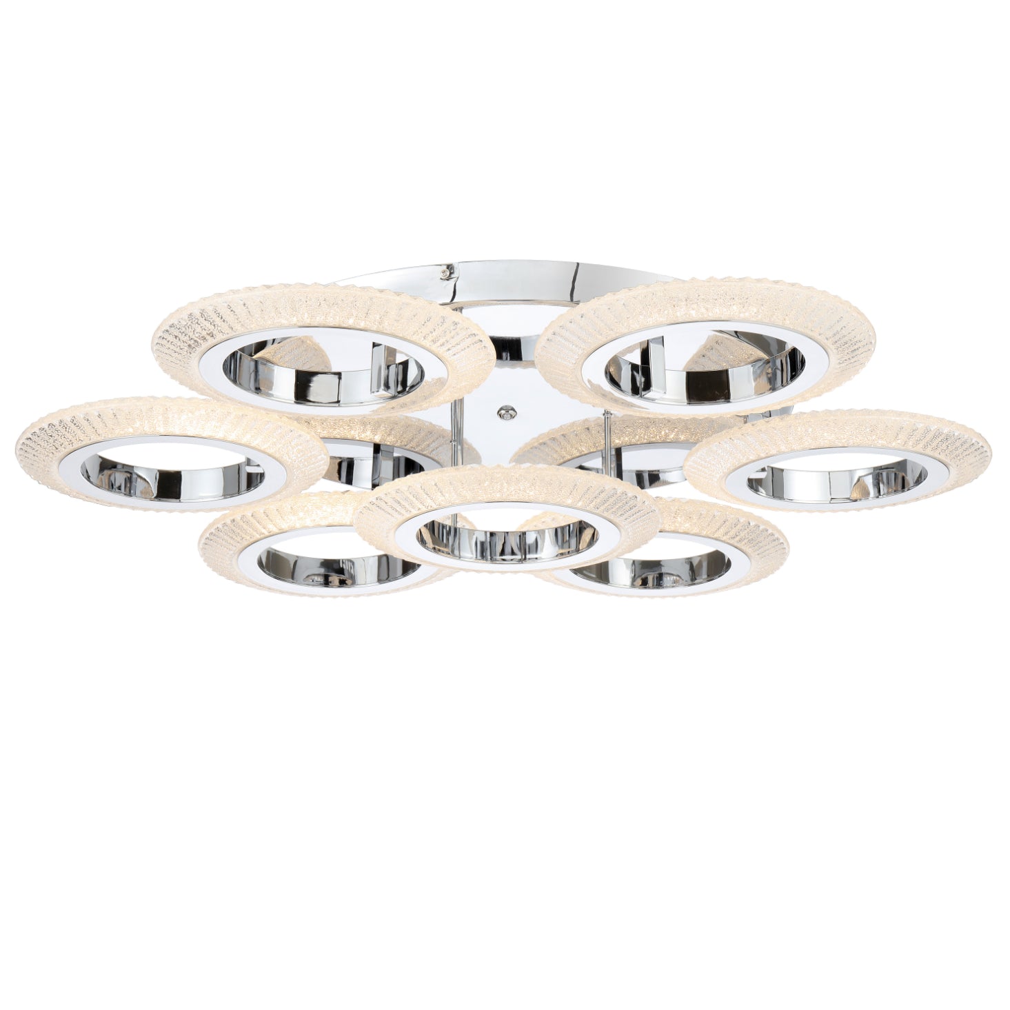 Elevate your space with the Luna LED Ceiling Lamp—an embodiment of decorative sophistication. Orbiting the central ceiling canopy, unique facetted clear outer rings create an enchanting play of light, while the mirrored center enhances the room's radiance. You can choose between warm or cool light for versatility from wall switch. Available in three sizes, Luna seamlessly combines style and functionality, casting an inviting glow in any setting. Memory function: choose the desired colour temperature, turn it OFF and wait for 10s before turning it ON again.