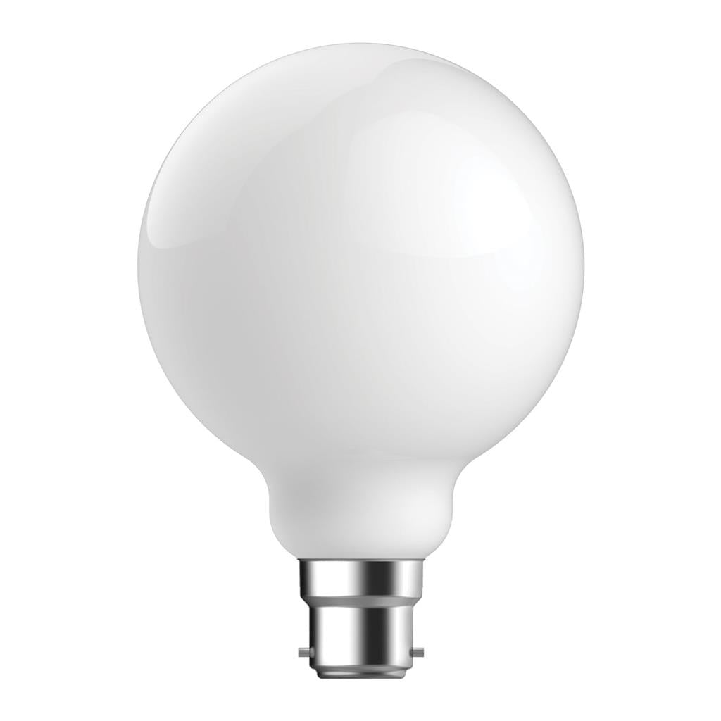 8.5W spherical classic vintage globe, G95 shape. Available in ES (E27) and BC (B22) base options. Available in 2700K (Warm white) and 6500K (Daylight) LED colour temperature option. Frost glass. Fully dimmable with suitable dimmers.