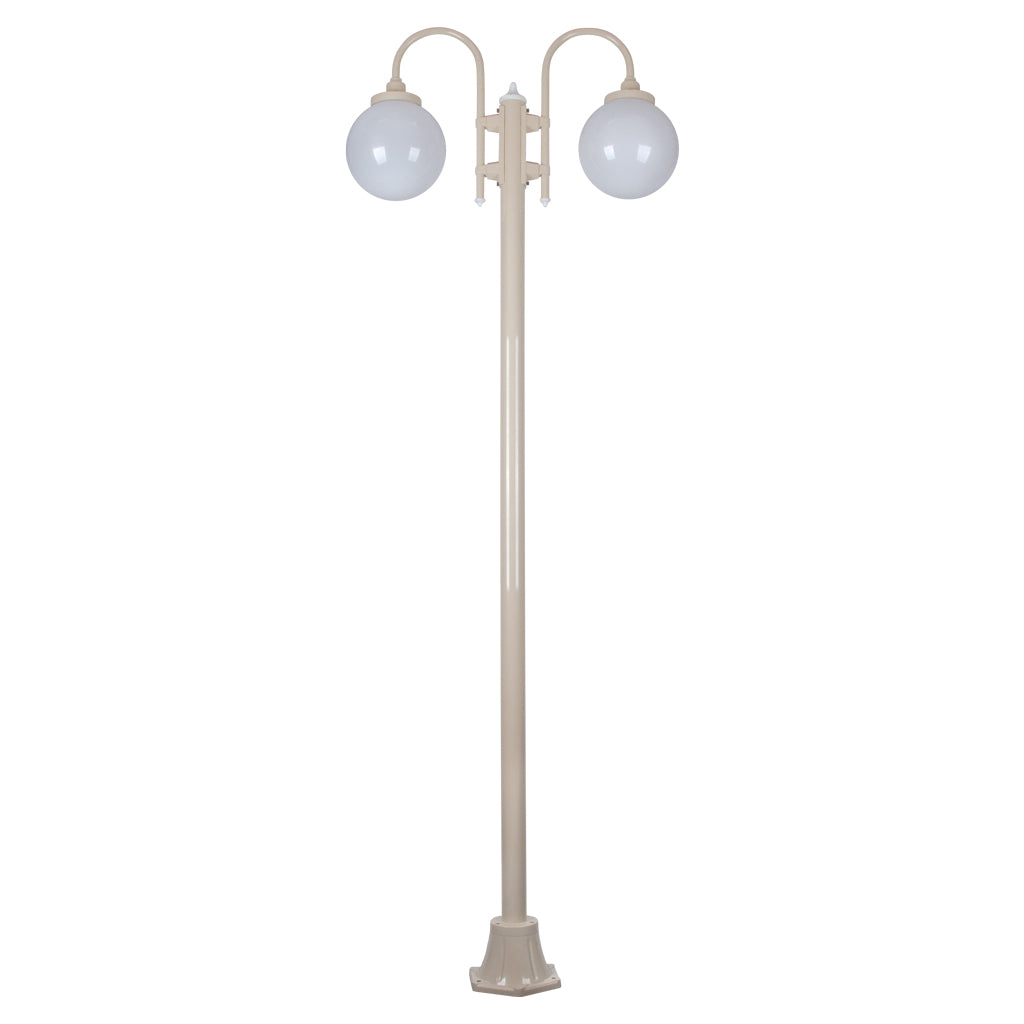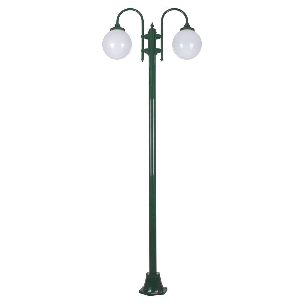 Lisbon 2 light curved arm 2.4m twin head down facing post light, die-cast aluminium body complete with 250mm opal acrylic sphere. Made in Italy, assembled and powder coated in Australia.