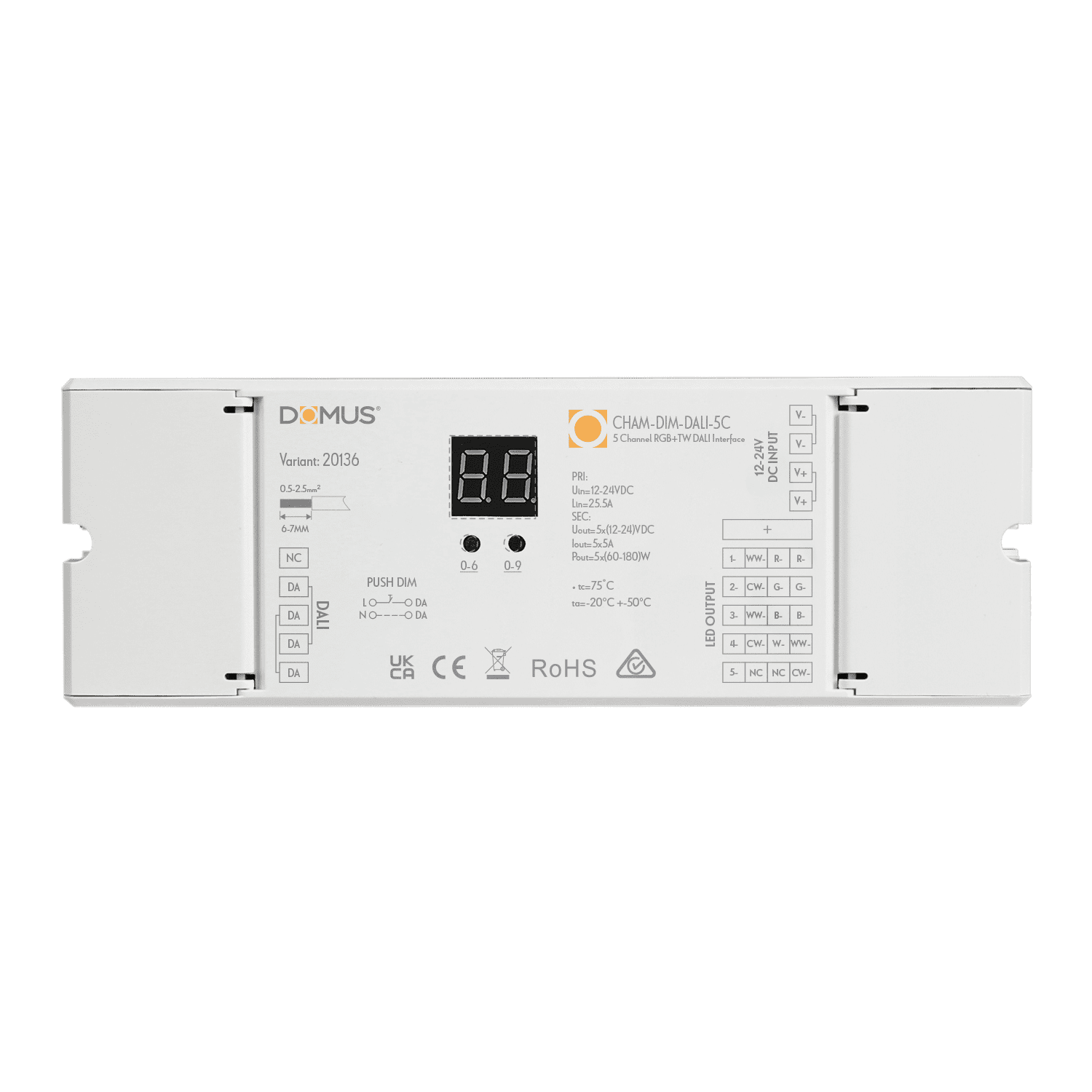 The CHAM-DIM-DALI-5C is an interface designed to suit DALI dim applications. Intended for use with constant voltage 12-24VDC lighting products the CHAM-DIM-DALI-5C offers seamless integration between automation systems. Accepts standard DALI signal generated from any automation system. Featuring 1-5CH of dimming, allowing control over single colour, RGB, RGBW and RGB+TW LED lighting products. The CHAM-DIM-DALI-5C makes integration a breeze with options for Auto addressing or manual addressing function.
