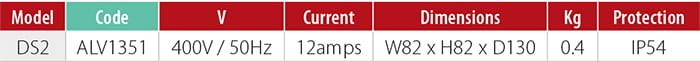 | DS2 | ALV1351 | 400V / 50Hz | 12amps | W82 x H82 x D130 | 0.4 | IP54 |