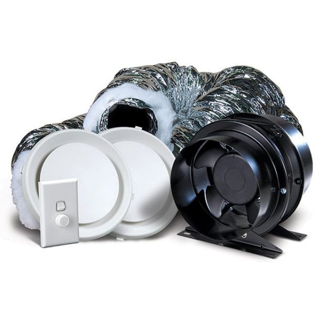 The kit includes: 1 x A60 axial fan; 2 x 6WRC–150mm cone grilles; 1 x 6m/150mm insulated flex; 1 xA500 speed controller; 1 x duct tape