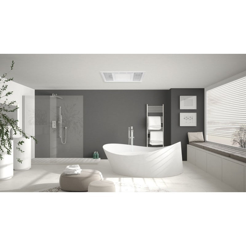 High performance - energy efficient 3 in 1 bathroom unit with integrated fan heater, LED light and exhaust fan.