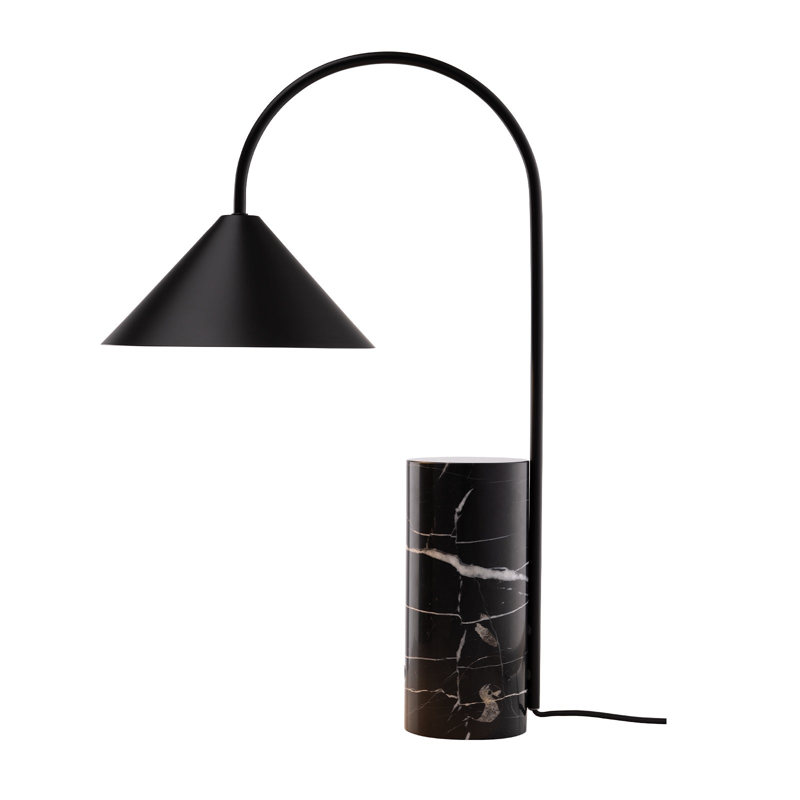 Table Lamp in matte black with black marble base. The Arcus Table Lamp is a study in sculptural balance. Anchored by a solid black marble base, a slender arched arm in matte black metal extends upward and over, supporting a conical shade.