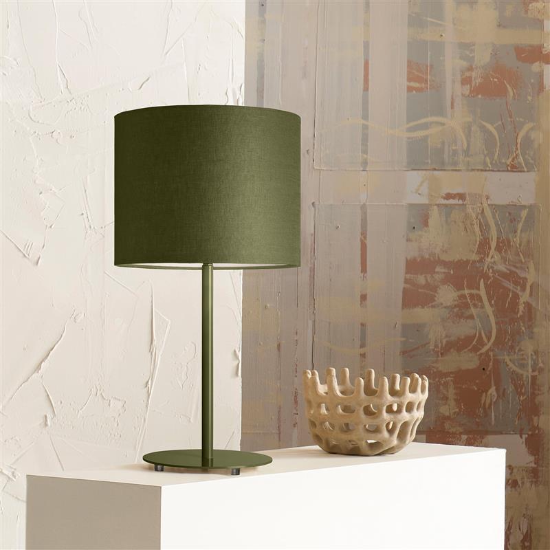 Contemporary table lamp with a colour matched 25cm shade in various shades.