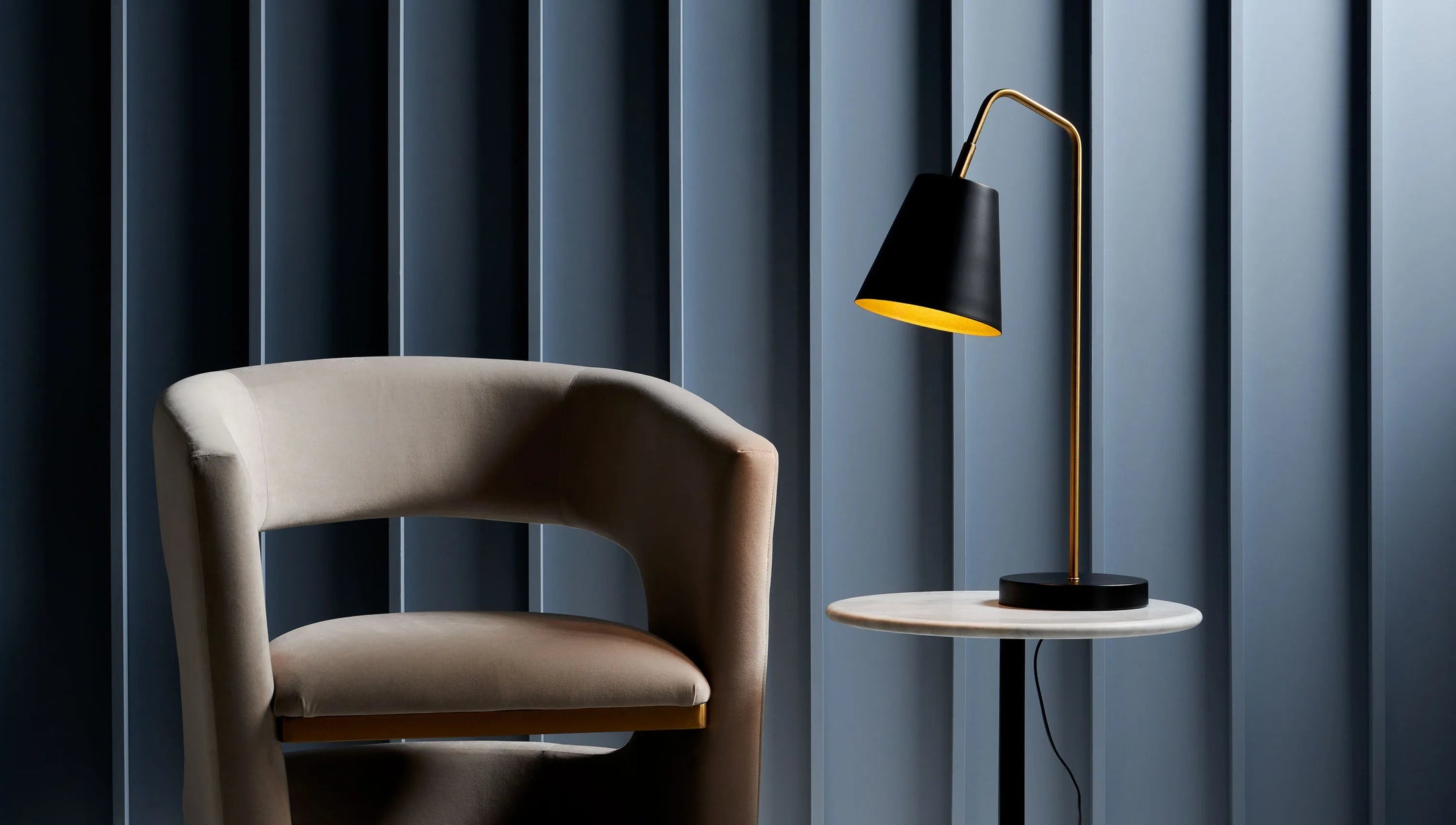 The Soma Desk Lamp in Satin Brass comes with a Satin Black base and Satin Black shade with Gold inner. Instantly flatter your space with this endearing lighting piece.