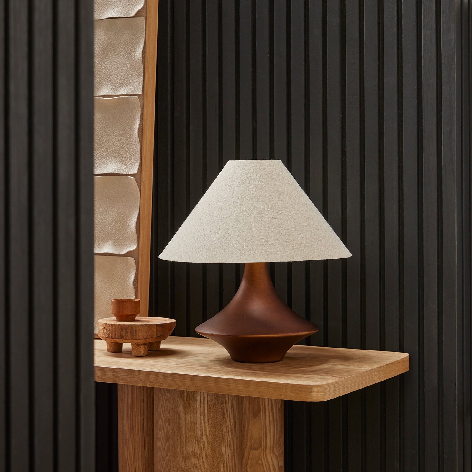 Ceramic Table Lamp with an aged bronze finish and natural linen shade. The Vella Table Lamp combines a bold sculptural ceramic base with a wide cone linen shade that softens its dramatic form. Finished in an aged bronze, the base adds richness and depth, while the linen shade diffuses light with a warm glow.