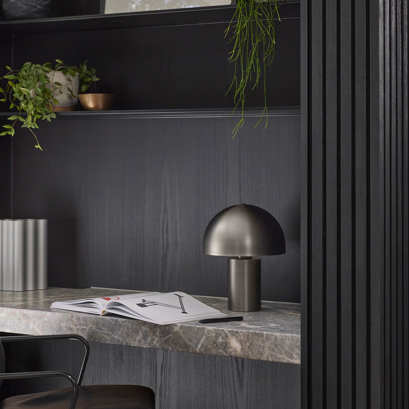 Mushroom Desk Lamp in Brushed Nickel. The Ore Desk Lamp is a composition of pure geometric forms. The cylindrical base and domed shade create a balanced silhouette that feels both timeless and modernist.
