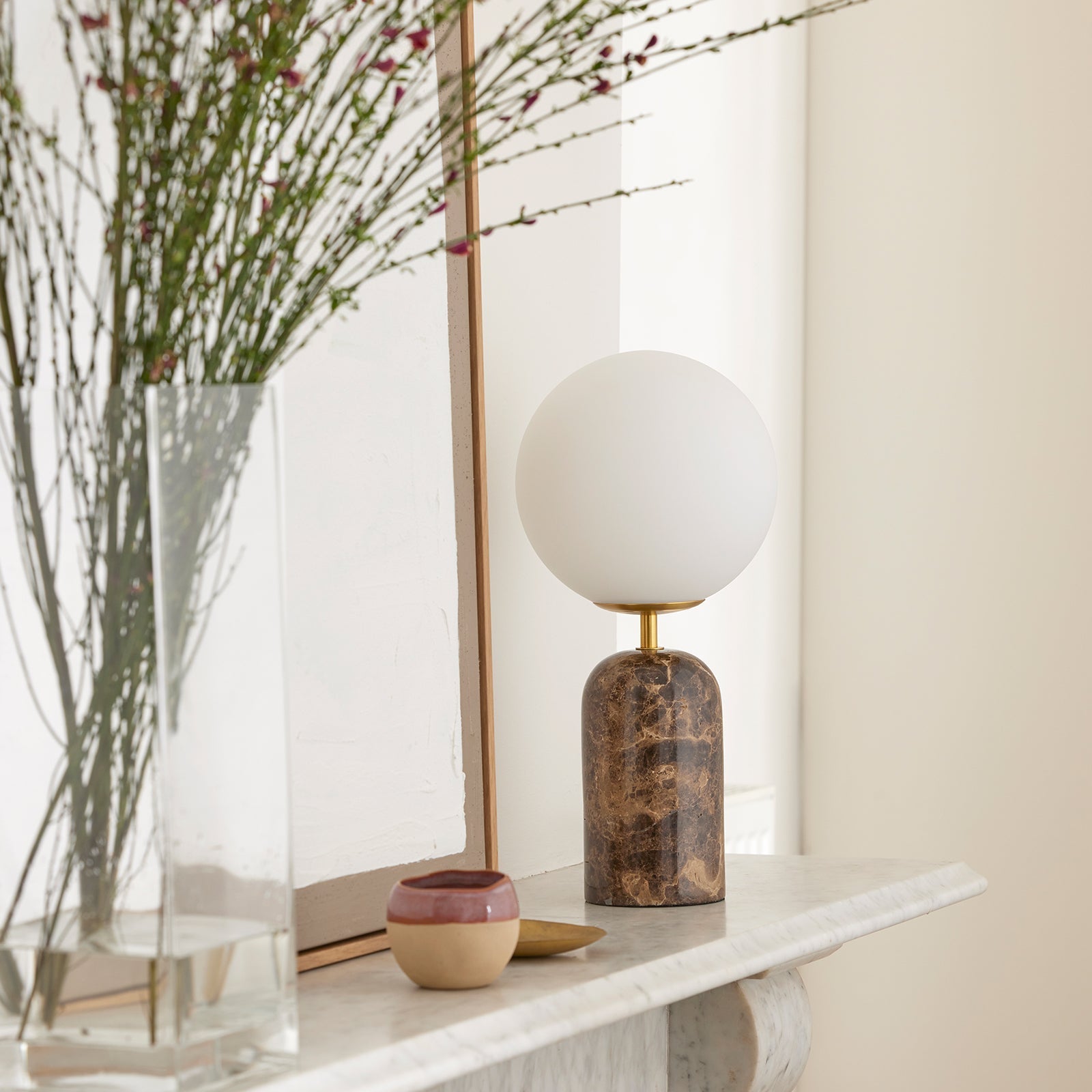 Desk lamp in Brown Marble, brass & frosted glass. The Soren range features the earthy colouring and natural variation of Stone with a carefully honed finish. The Soren is also available in table lamp and floor lamp versions, with a frosted glass shade.