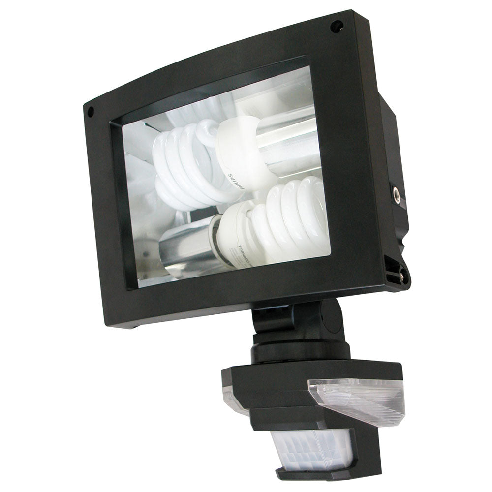 Energy saving outdoor (IP44) wall mounted sensor flood light with LED safety light. Adjustable flood is designed for use with LED or compact fluorescent globes. 180 degree detection angle, max distance approx 12m (at 2.5m ideal mounting Height). Duration Time - approximately 5 seconds to 5 minutes. Lux Control Level (daylight) also adjustable.