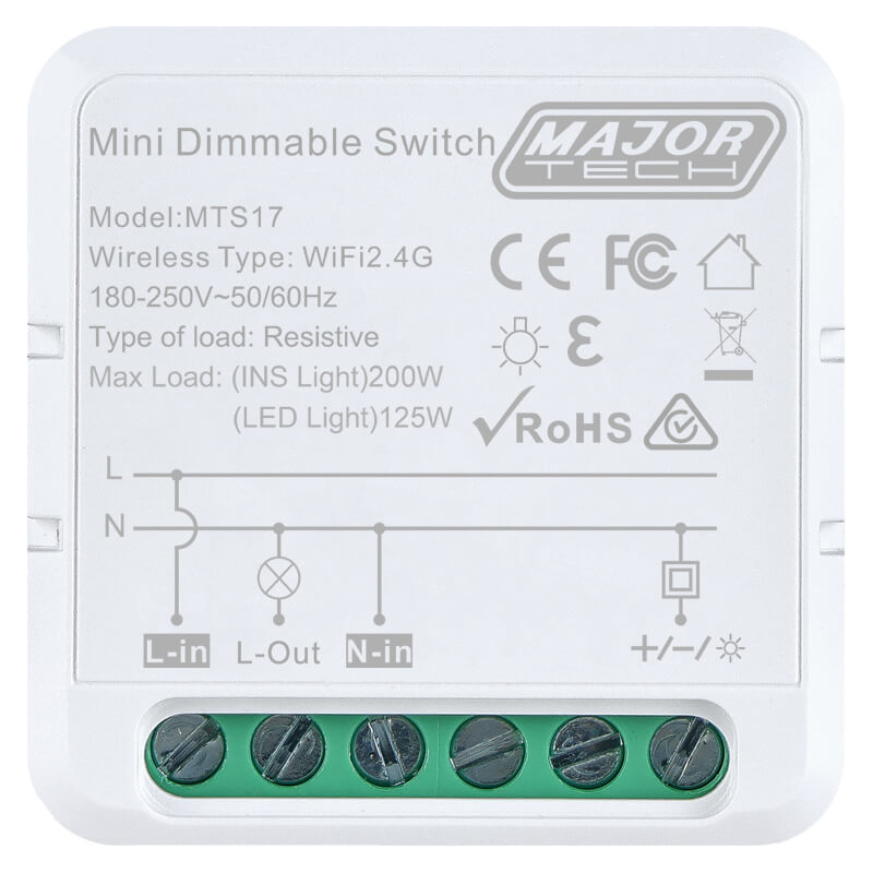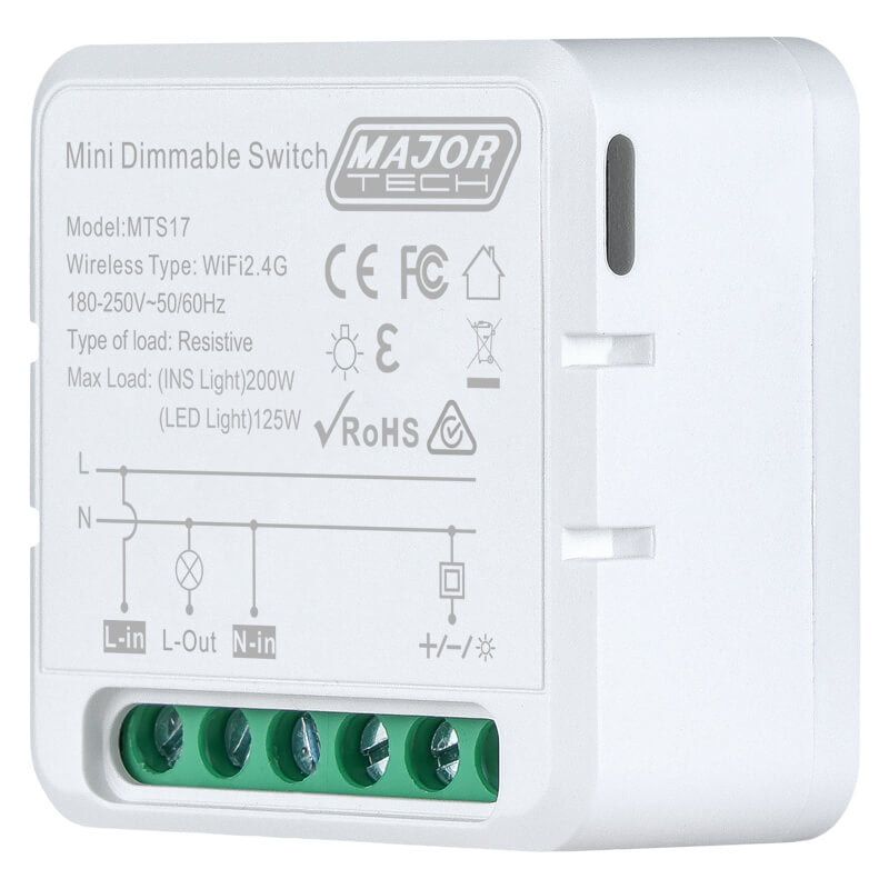 The MTS17 Smart Dimming Module is a versatile solution designed for seamless integration into any existing dimmable or bell press switch setup. This retrofit-friendly device offers smooth and precise dimming control, allowing flicker-free adjustments in 1% increments from 1% to 100%, supporting both LED and incandescent lamps. Through the Major Tech Hub app, users can effortlessly manage lighting, set custom brightness levels, and create personalized automations, from simple on/off commands to more advanced routines with brightness changes in 1%, 10%, or 20% increments. The module supports advanced timing features, including Countdown, Schedules, Cycle Timers, Random Timer, and Inching Timer modes, offering total flexibility in lighting control. Its scheduling capabilities allow lighting to automatically align with daily routines, enhancing comfort and energy savings. With dual-mode connectivity via Wi-Fi and Bluetooth, the MTS17 ensures reliable performance, even during internet outages, and is compatible with 2.4GHz networks. Additionally, voice control via Alexa and Google Assistant makes hands-free operation easy and intuitive. Designed with energy efficiency in mind, the MTS17 empowers users to optimize usage while creating the perfect ambiance, anytime and from anywhere.