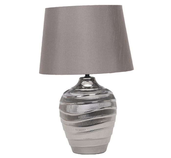 This new and improved Lena table lamp features a silver ceramic base with a textured, wavy design. The base is topped with a simple, grey drum shade. The lamp would complement a variety of décor styles, from modern to traditional. It would be a great addition to a living room, bedroom, or office.