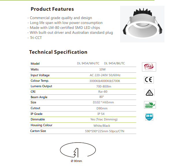 3A Lighting 10W Trimless Downlight DL9454 Tri-colour
