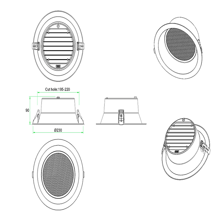 Size: Ø230x90 mm/cutout:Ø195-220mm
