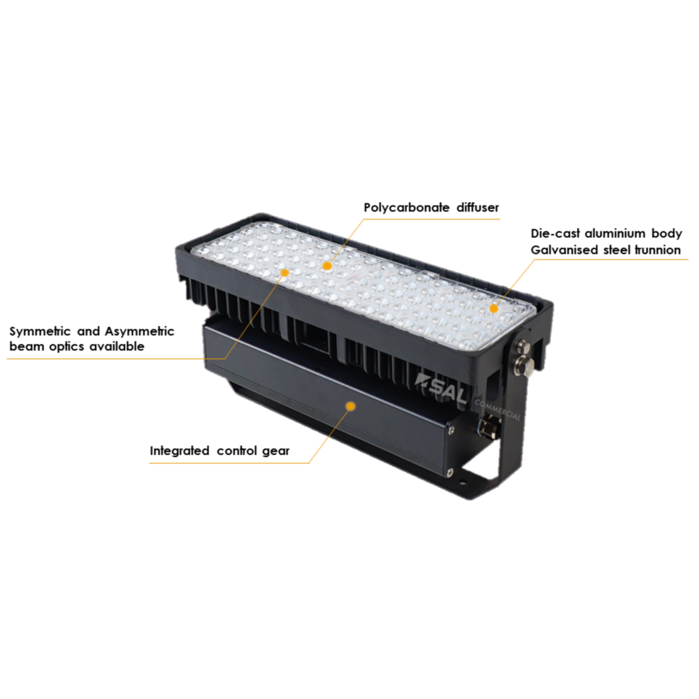 Die-cast aluminium body with a galvanised steel trunnion arm powder coated in black Available in both 75w and 100w in 8 distribution types - both symmetric and asymmetric High efficacy >160lm/w in 5000K as standard, 4000K and 6500K available upon request UV stabilised polycarbonate diffuser, CRI70 as standard Integrated control gear, fixed output as standardAvailable Options