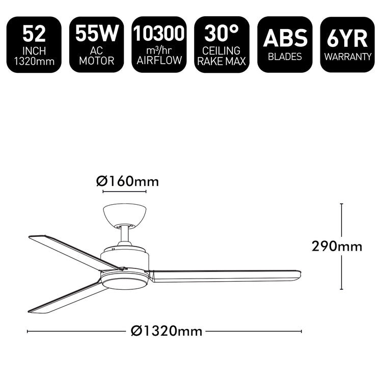Minimalist 3-blade all ABS ceiling fan that will compliment any decor. An easy Slide-On blade design will reduce installation time. The perfect fan for any room, including outdoor/coastal areas.
