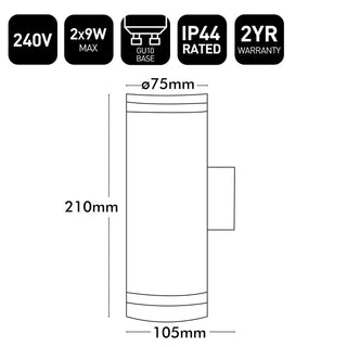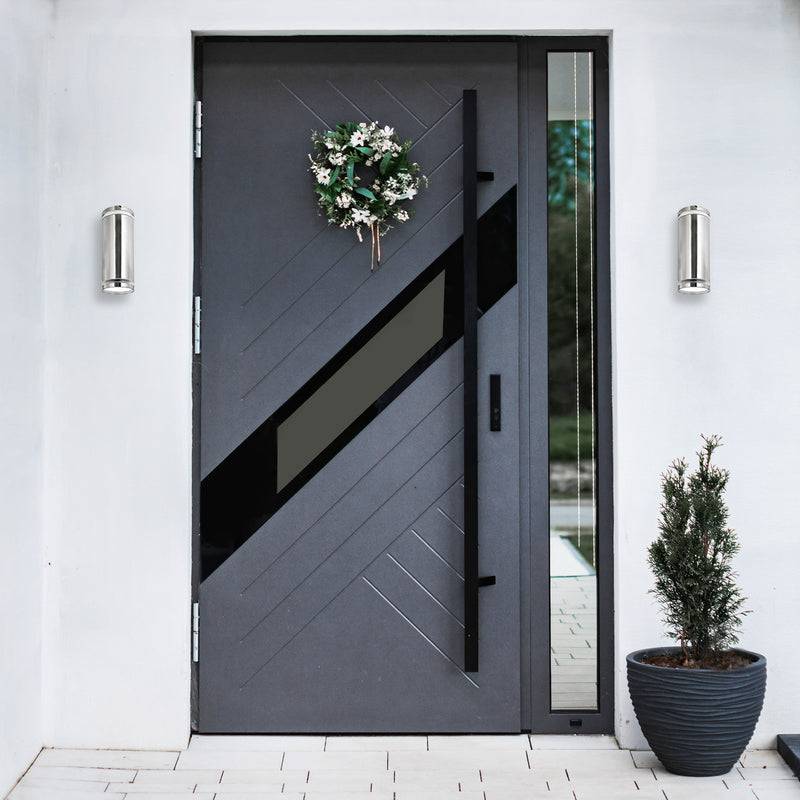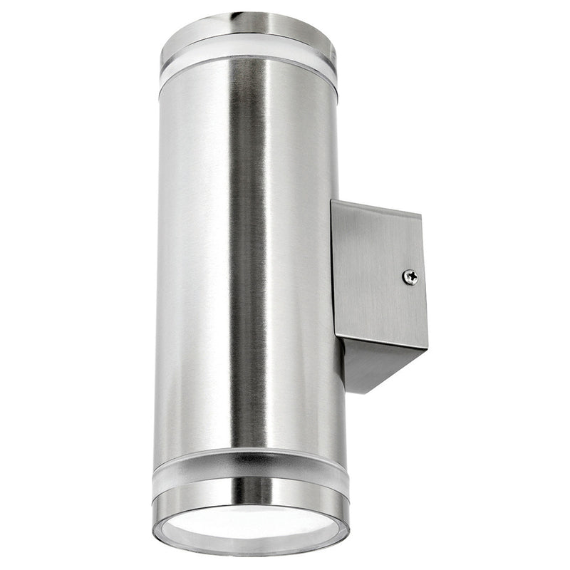 Modern energy saving exterior wall lights constructed from stainless steel, in either downward or up/down configurations.
