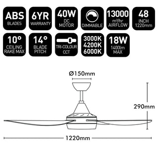 The Vector DC with Light now comes in an all-new modern design, that will complement any decor. The Tri-Colour CCT light is now switchable on the LED array and a powerful yet quiet DC motor that produces market-leading airflow. Optional wall controller (hardwired) & Smart WiFi receiver are available to purchase separately.