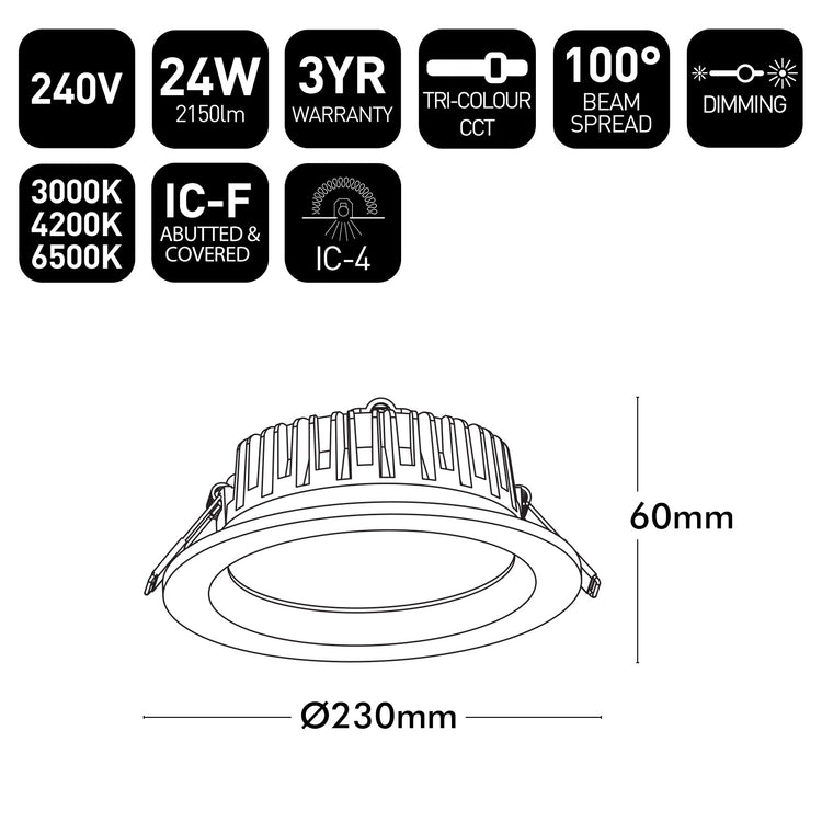 The ideal downlight for new or existing downlight installs. Its fixed design provides a wide angled diffused beam. Change the colour temperature from warm white to cool white or daylight.