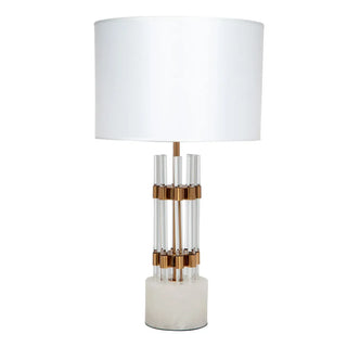 Understatedly glamourous, the Abbey table lamp fuses a gorgeous white marble cylindrical base with 8 clear glass rods bound by an elegant brushed brass finished iron rod and brace. Standing 70cm tall, the Abbey table lamp has been designed to slip seamlessly into classic or contemporary interiors injecting a sense of timeless luxe. Complete with a white linen look drum shade and elegant harp and finial fitting, the Abbey table lamp is one to love.
