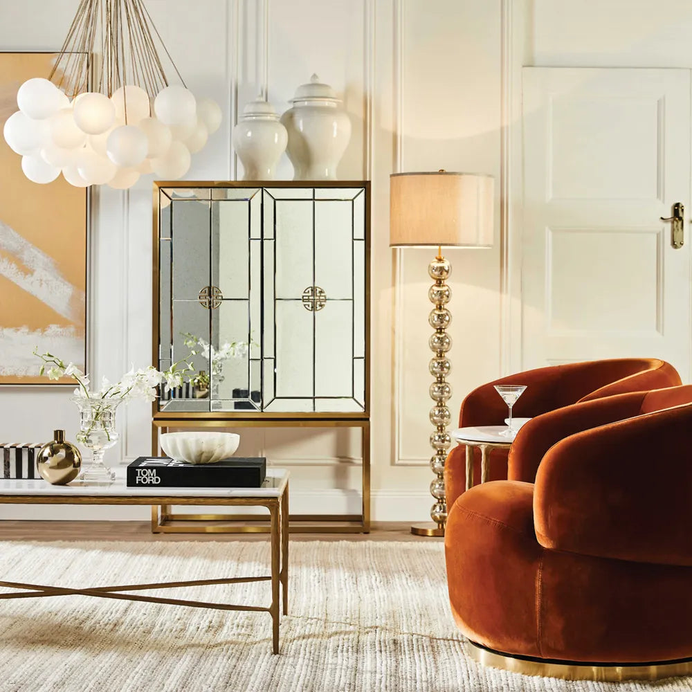 Need a bit of an eclectic touch to your room, then the Evie Floor Lamp is the one for you. The mercury glass baubles which are interspersed with brass fittings makes this lamp a good fit for your Art Deco theme. It is topped with a gold thread drum shade. The Evie range is also available in matching table lamp.