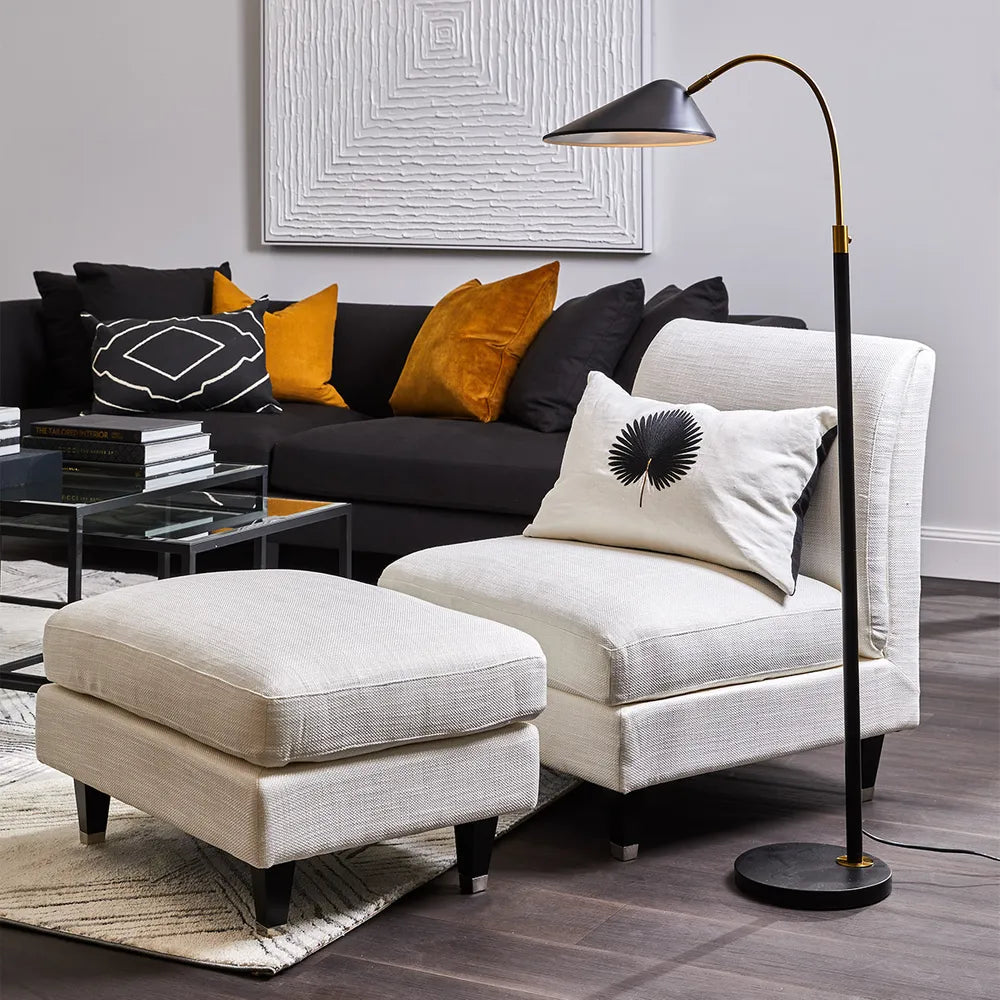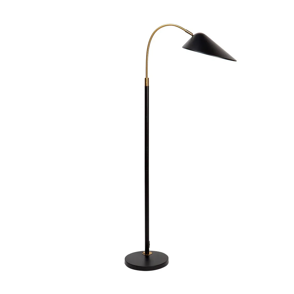 Our Kenya Floor Lamp comes with curves and a sense of style. The new aged brass stem extends from a black base and is topped with a unique triangular curved shade. Utilize this stunner in your posh living room or your modern office space. Matching table lamp is also available for you to have a complimentary set.
