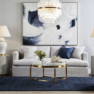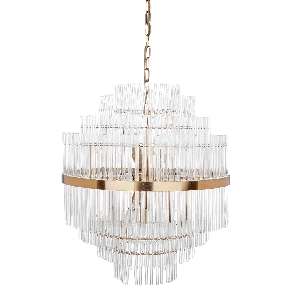 Grand in size and sculptural form, the Lawrence pendant finds a sense of balance between exceptional elegance and extraordinary drama. Crafted with hundreds of clear glass rods delicately dangling from a polished brass frame, the design echoes art deco glamour. The Lawrence pendant commands any living space