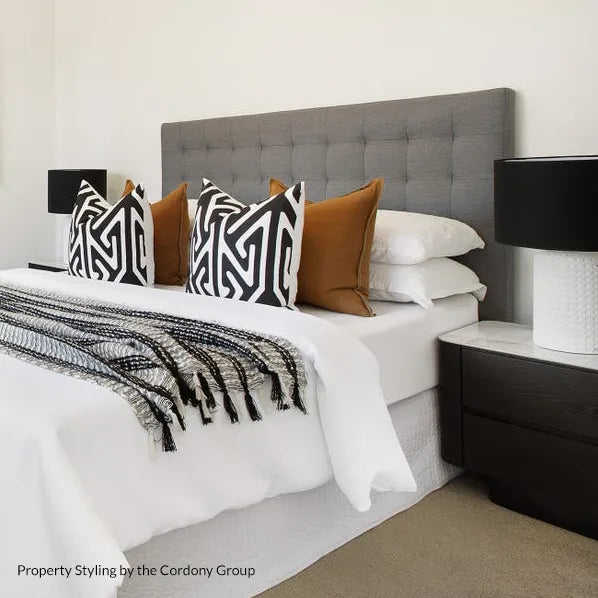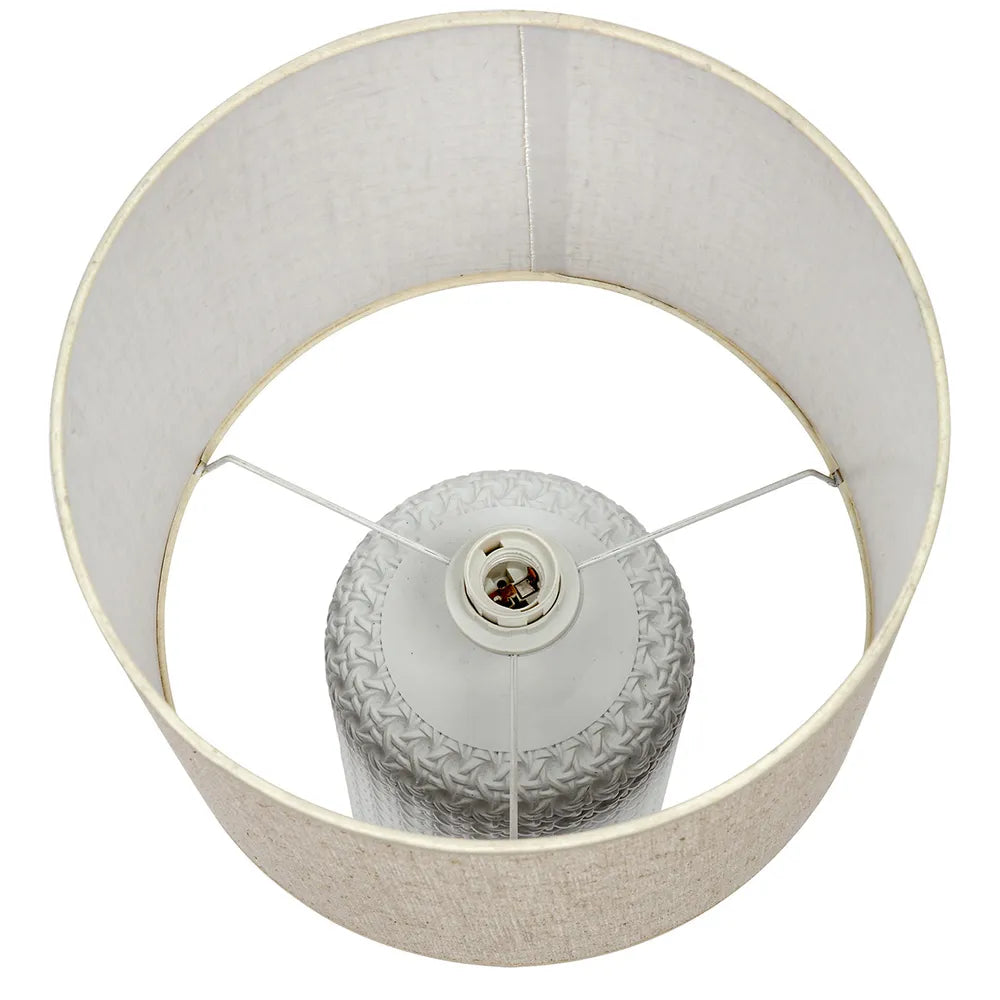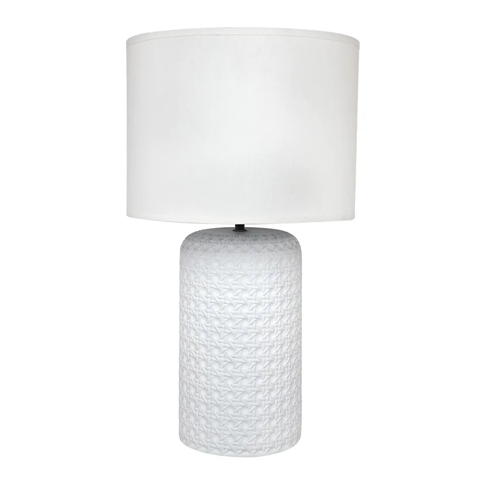 Add gorgeous texture to your interiors with the Patronga table lamp. Featuring a white woven rattan patterned base in a matt ceramic finish contrasted by a natural or white or black linen look drum shade, creating a cool modern vibe. This well-proportioned lamp is perfect for bedside lighting or living room luxe.