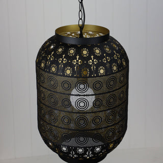ALHAMBRA pendant features Arabic stencil cutouts, in swirls and floral patterns. Matt black on the outside, old-gold on the inside to enhance the glow, as light is emitted through the metal shade. Suspended on a chain and cord, nice choice for dining, entries, or over bedsides. Available in two sizes.