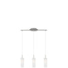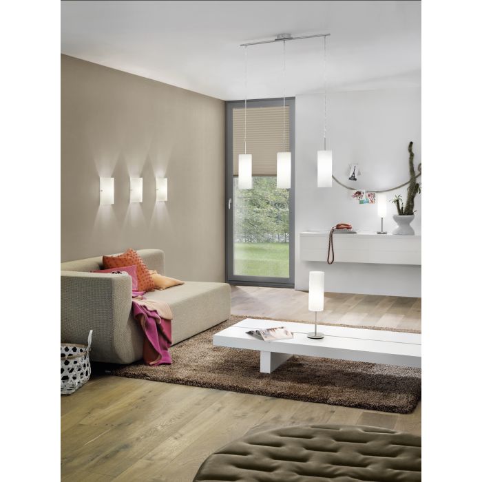This pendant luminaire from the series TROY3 is made of satin nickel steel and has an opal matte glass.