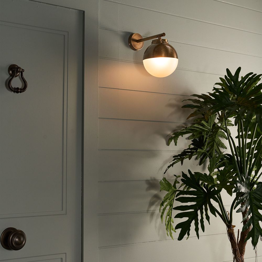 Cast a stylish glow on your outdoor oasis with our Carrington Outdoor Wall Light, a fixture so elegant, it transforms every entrance into a grand affair. Boasting a round black plate and a sleek bar cradling a globe of half glass and half brass, this luminary masterpiece exudes modern elegance. Whether illuminating your outdoor entryway or oasis, or adding sophistication to commercial alfresco areas, let the Carrington Wall Light illuminate your path with unparalleled style and grace.