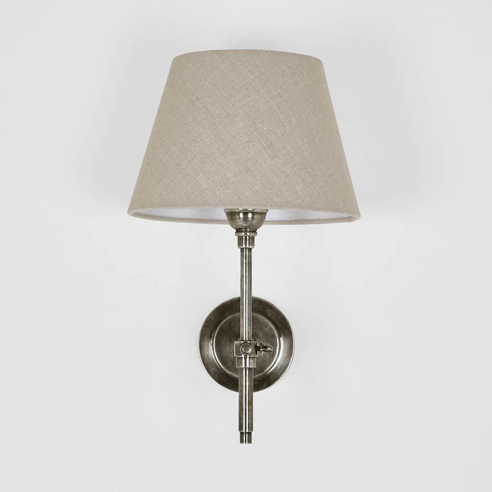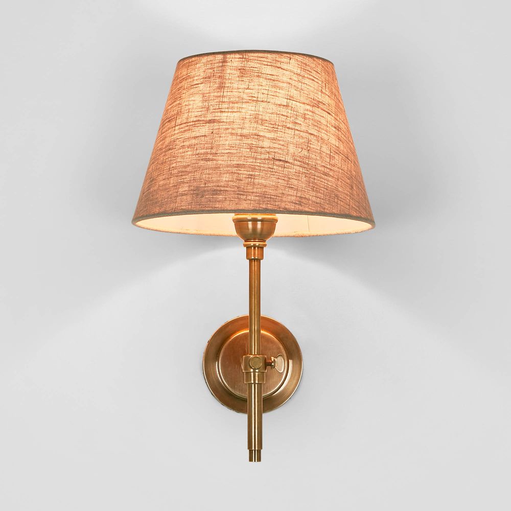 Our Dino Wall Light Base in antique brass is a stylish and modern lamp designed for use as a wall sconce. The base of the lamp is made from brass metal with choice of antique brass/silver finish, giving it an elegant and timeless look. The lamp features a straight-line arm that extends from the base and supports a tapered linen shade, which diffuses the light and creates a warm and inviting atmosphere in any room. This lamp is suitable for use with an E27 bulb, which is not included with the lamp. It is also compatible with dimmer switches, allowing you to adjust the brightness of the light to suit your needs. Overall, the Dino Wall Light Base in antique brass/silver is a beautiful and functional lamp that would make a great addition to any home or office space. Its simple yet elegant design and high-quality materials ensure that it will provide both aesthetic and practical benefits for years to come.
