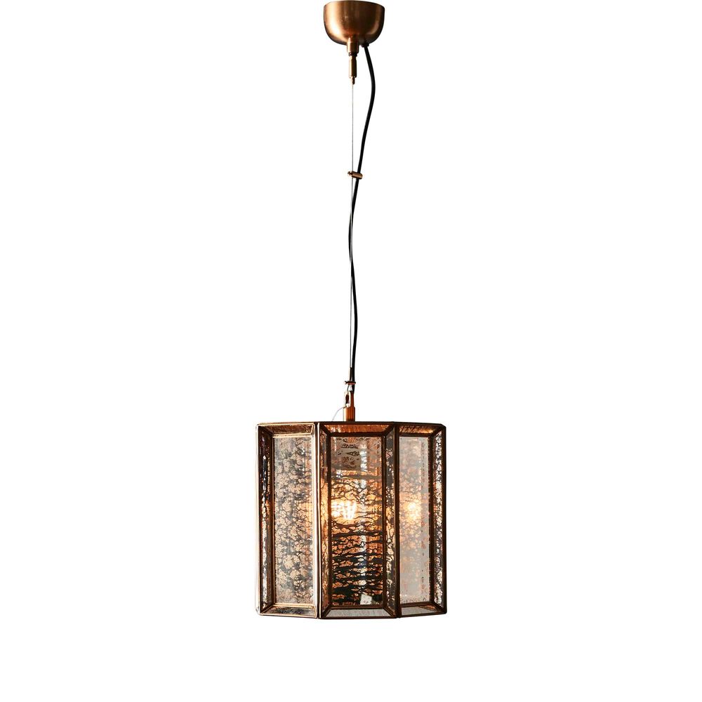 Our Orion glass hanging lamp is magnificently crafted in a stunning design. This beautiful bevelled cylinder pendant features mercury mirror glass light with a stunning bronze metal cage and will be perfect statement piece for living space. Crafted from mercury glass, it offers two different looks when switched on or off. Light shines through the glass to create glowing effect. The suspension cord is adjustable with metal string to ensure this pendant is hung at required height.