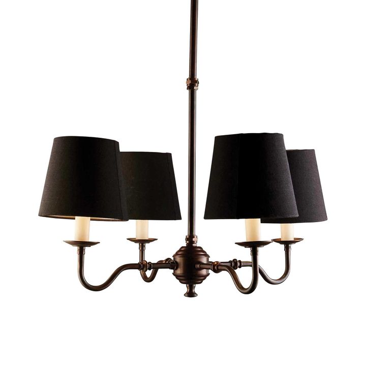 Our Milton lamp is traditional 4 arm chandelier in solid brass with two available antique finishes: silver and bronze. It features a baroque inspired design that is perfect to add a sense of classic style to any modern room or to add to the sophistication of any elegant setting. The light is suspended on three metal rods and can be adjusted for height by removing rods as necessary when fitting. Recommended size shade for this chandelier is 7 and 8 inch on bottom diameter.