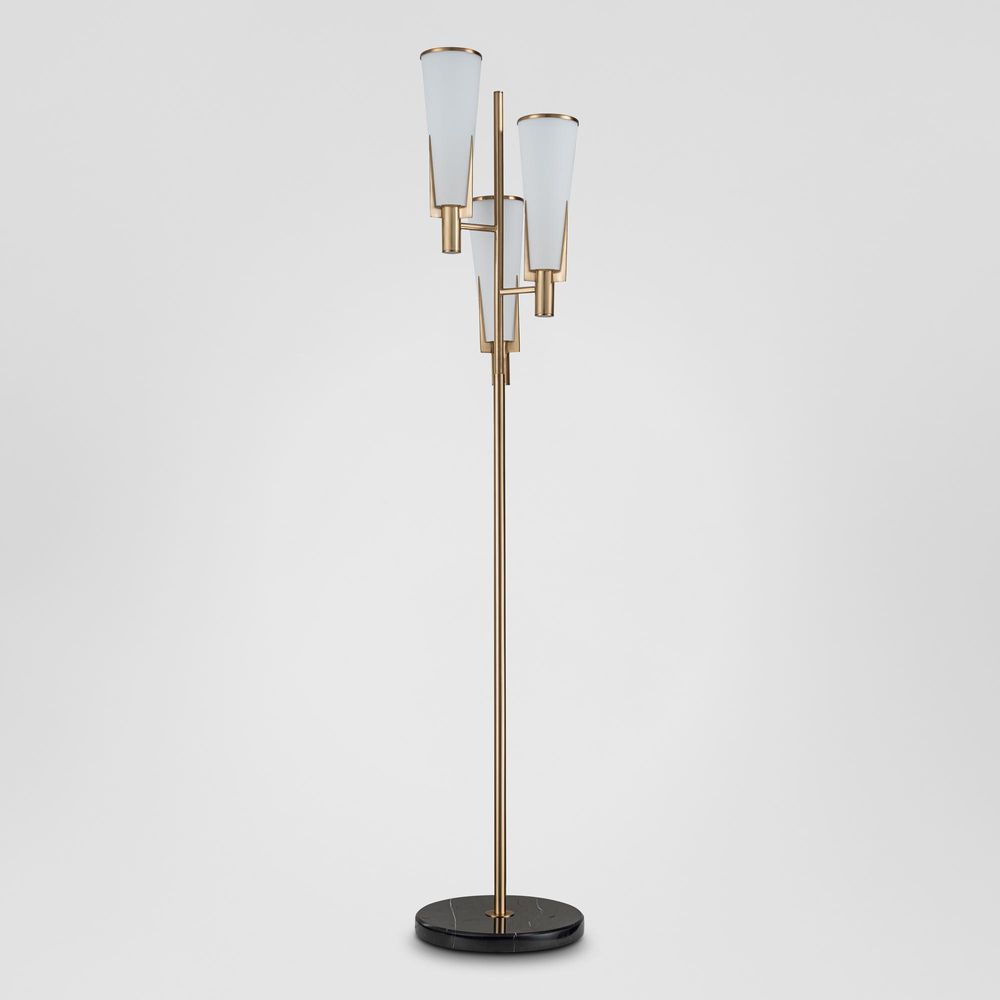 Set the mood in style with our St. Germain Floor Lamp. With its long, slender brass-finished iron frame supporting three frosted tapered glass shades, this luminary exudes a soft, inviting glow that elevates any space. Whether nestled in an empty corner space, illuminating a cozy reading nook, or gracing the reception area of a commercial space, the St. Germain Floor Lamp adds a touch of refined charm to every corner it brightens.