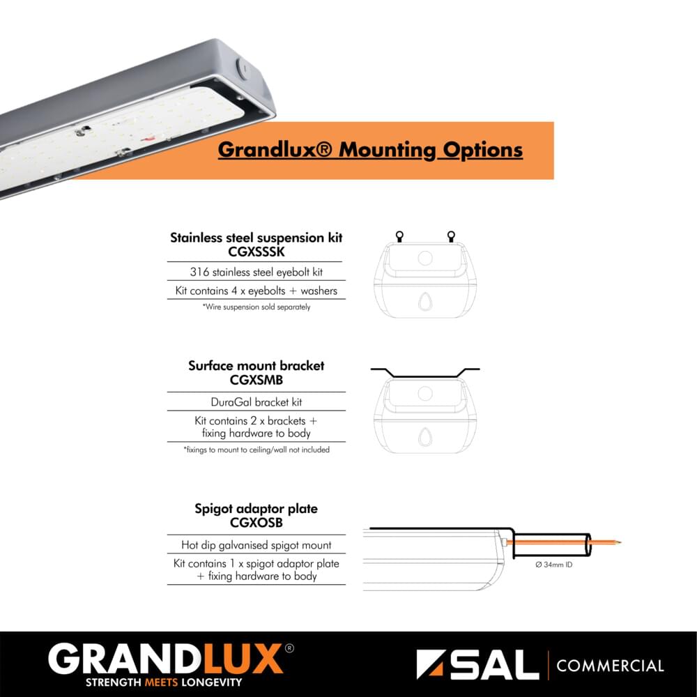 through a wide range of temperatures, from -30°C up to 50°C. It also comes with surge protection device to help keep your fittings safe from damage during a power outage. Available in both 2ft and 4ft, the Grandlux range includes Emergency, Integrated night light, In-built motion sensor and Multi-colour models.For a luminaire that will stand up to the toughest conditions, and provide reliable