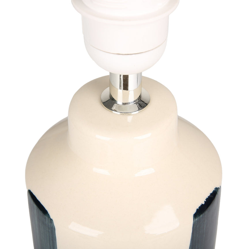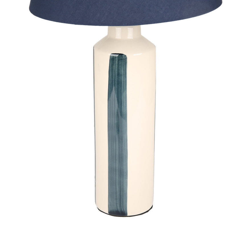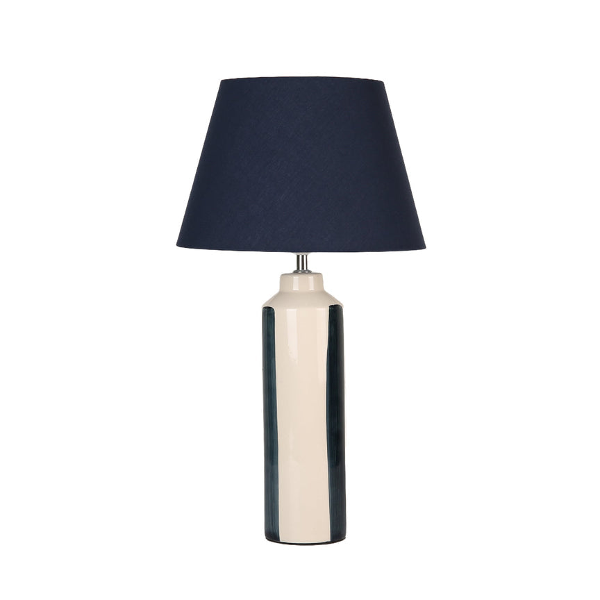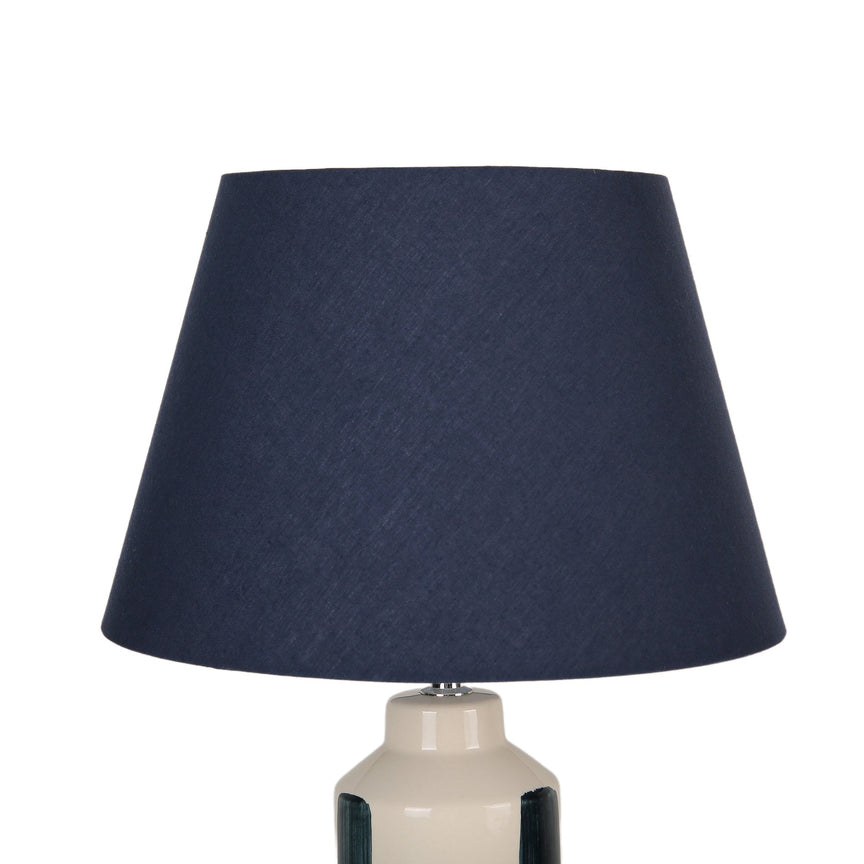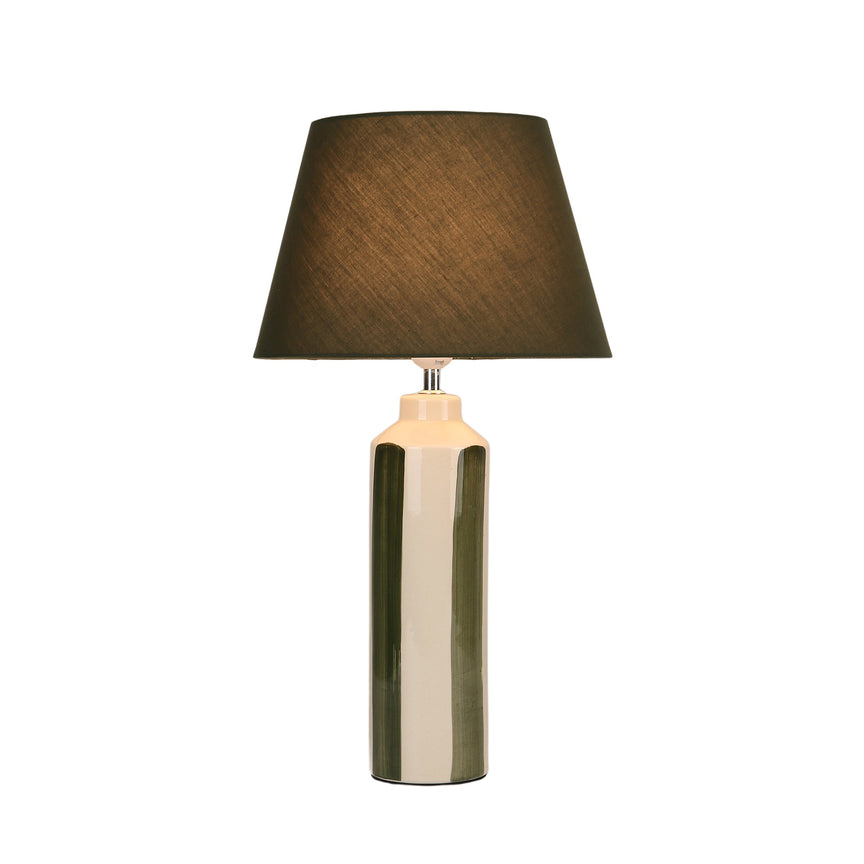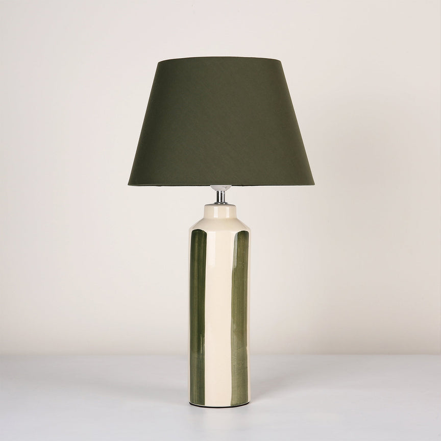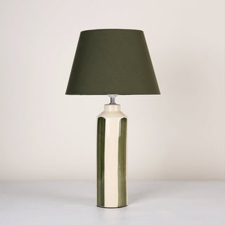 Light up in style with this contemporary table lamp round riser. Constructed from ceramic, it comes in a green stripe and blue stripe finish pattern with an elegant geometric look. A green cone shade on top provides a clean finishing touch. Perfect for living rooms, bedrooms, family rooms, and more.
