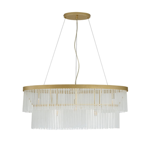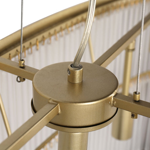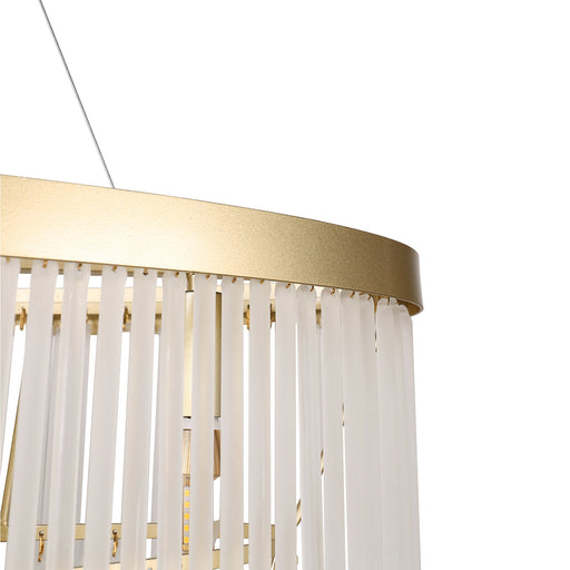 The Greer 5-Light Chandelier blends mid-century art deco charm with modern architectural design, featuring cascading frosted glass rods, painted gold metalwork, and height-adjustable suspension. Its soft, luxurious glow adds glamour and sophistication to any room, making it a perfect statement piece for your home.