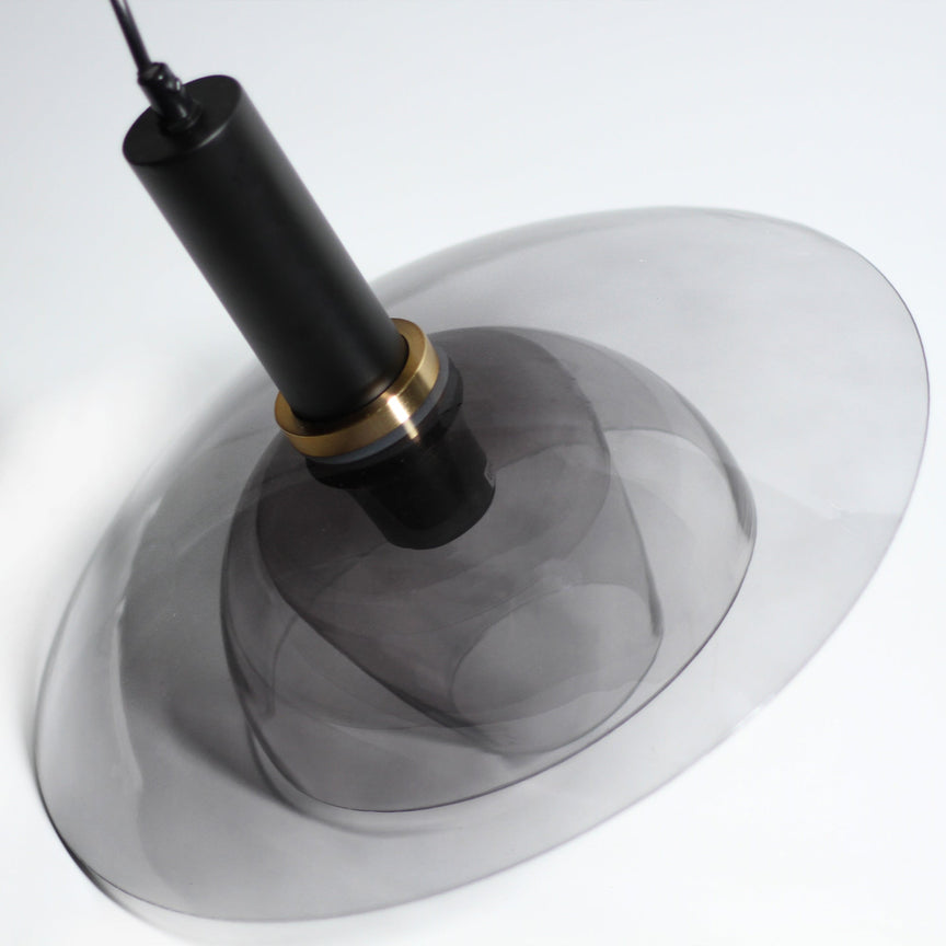 This striking design consists of three inverted glass bowls of descending sizes that cascade almost like flower petals. This unique glass design is fixed to a matte black cylindrical base with a stylish slimline copper collar. There are two different colour glass shades, including a lighter and darker tone. The glass filters light ascending ambient coloured light up to the ceiling while the open centre allows unobstructed light to be directed directly below.