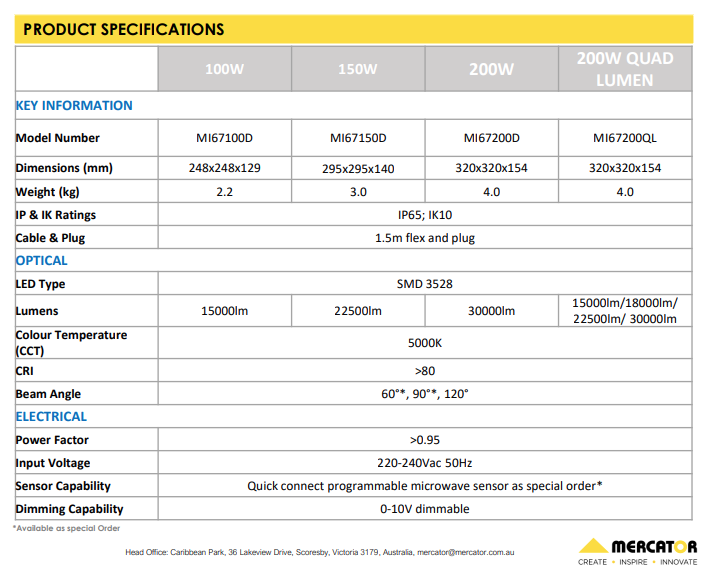 • 200W Quad Power model include 100W 15000lm, 120W 18000lm, 150W 22500lm, 200W 30000lm.