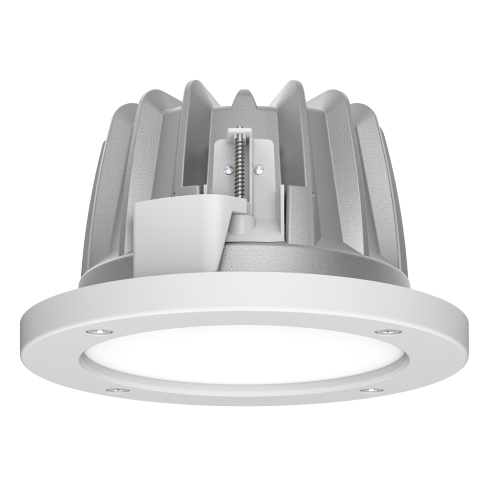 200mm Ø Light weight die-cast aluminium body for efficient heat dissipation with IP65 IK10 trim fitted 20w, 2900lm High output SMD LED chips, L90 > 50,000 hours, CRI 90 and 4000K as standard with white trim Excellent glare control with set back optical design, 60° beam optic as standard Remote constant current non-dimmable LED driver as standard Quick release mounting clips for easy installation or maintenance