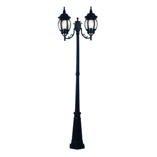 Traditional outdoor twin head post light, complete with a flanged base. Powder coated aluminium, in a matt black finish, with clear, bevelled glass panels.