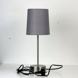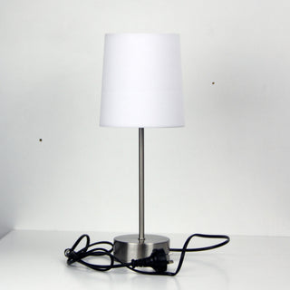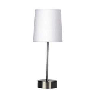 LANCET ON-OFF touch base in brushed chrome with a coloured poly-cotton fabric shade. It is the perfect addition to any bedside table.