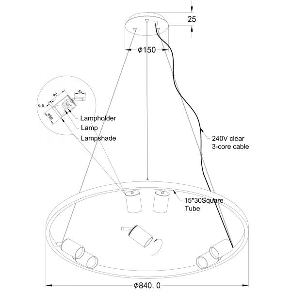 The PANO 6 light pendant uses replacable GU10 globes making maintenance easy. The spot-heads on the PANO are fully adjustable, allowing direction both up and down. The front of the spot-head is removeable for easier globe replacment. The stainless wire suspension is adjustable in length at installation, from approximately 50cmm down to the full suspension length of 150cm. PANO is supplied without globes, allowing the end user to select the most appropriate light source for their application. Ideal choice for a dining table or servery.