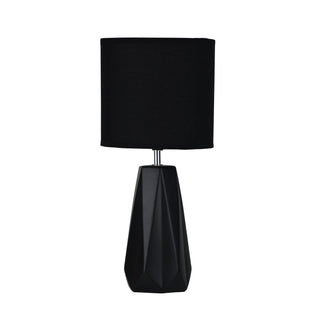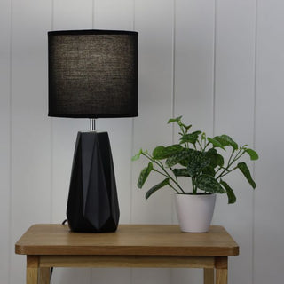 SHELLY ceramic table lamp complete with fabric shade. The multi-faceted base has a matt finish and is supplied with a matching poly-cotton laminated shade. Switch is conveniently on the cord. At 45cm high, SHELLY makes an ideal bedside lamp. Black shade, with a white lining.