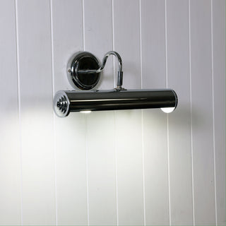 Traditional wall mounted picture light in antique brass plated finish. Can adjust the tilt of the shroud towards the wall, as required. Picture accomodates two slim globes, usually candle or tubular shaped.