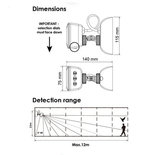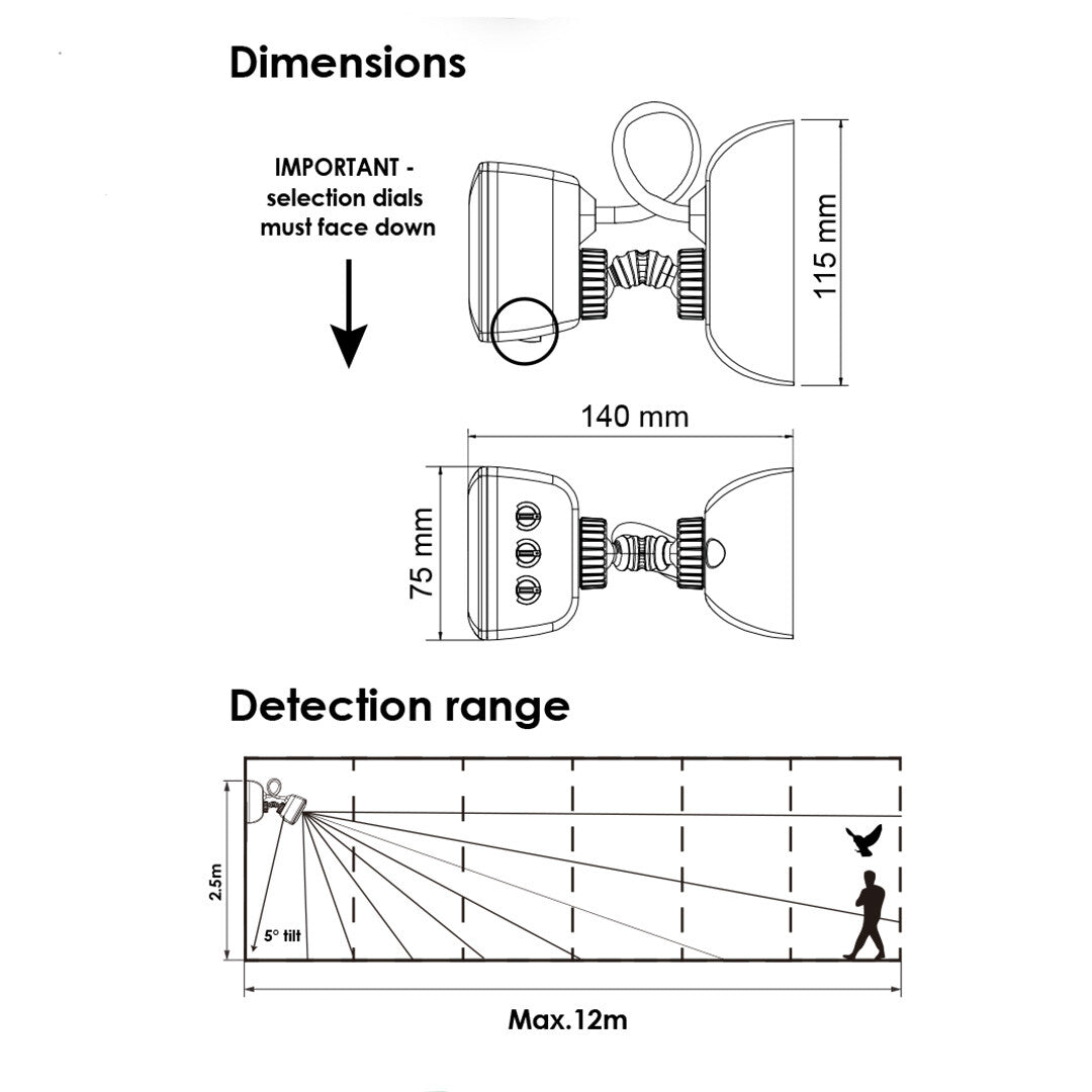 Detection angle 110° up to 12 metres at a height of 1.8 - 2.5m (Black model detection range 10 metres).
