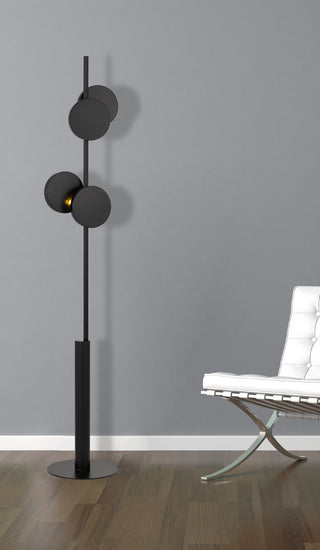 The Amparo Floor Lamp's elegant sophistication is inspired by the 1950s featuring silhouetted floating discs. Finished in satin black the Amparo will add a special touch to a contemporary interior. Place in the living room, office or on your bedroom.